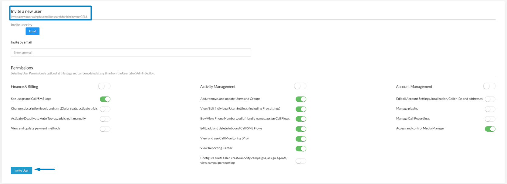 Go to your smrtPhone Dashboard and to the Admin tab from the left navigation. Under the Users sub-section, click the green +Invite User button. Simply toggle to the invitation type of by email, enter their email address, and click Invite User.