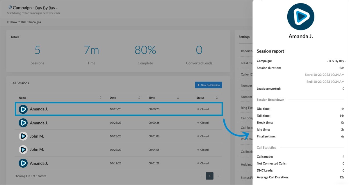 This Session report is per agent, per session, not overall, meaning you can easily track how much time is spent on calling in smrtDialer.