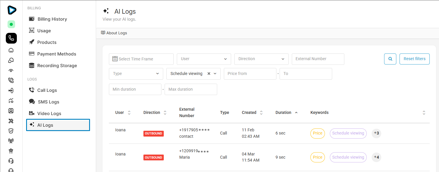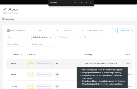 AI Logs are very useful because of their storage format. You can search and filter the recordings with filters' help, from keywords to call durations.
