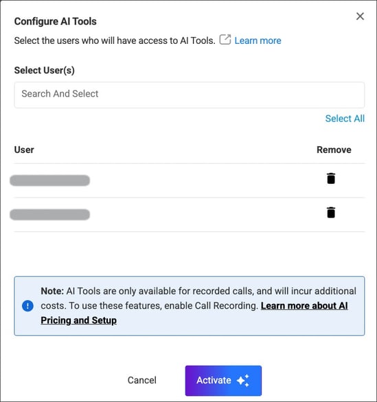 Once you decide on the users you what to add in here, hit Activate and you can move on to set up Keywords to be used in text recognition for Transcript and Summary.
