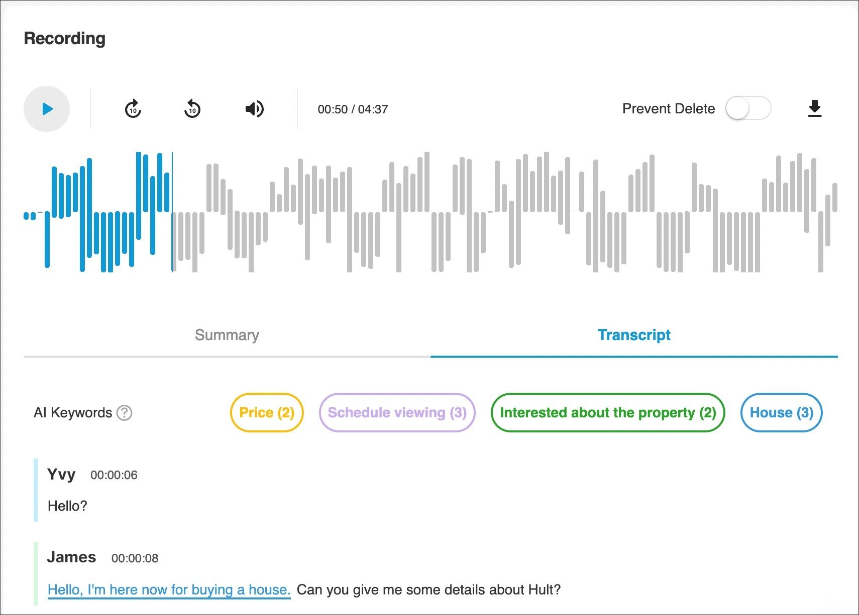 Moreover, when the recordings are pushed to CRM, will attach the summary and the transcript of the recorded call.