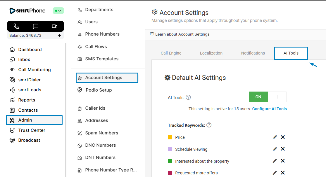 Edit keywords when you need to by accessing smrtPhone Dashboard > Admin > Account Settings > AI Tools. You can add up to 20 keywords and customize them at any moment.