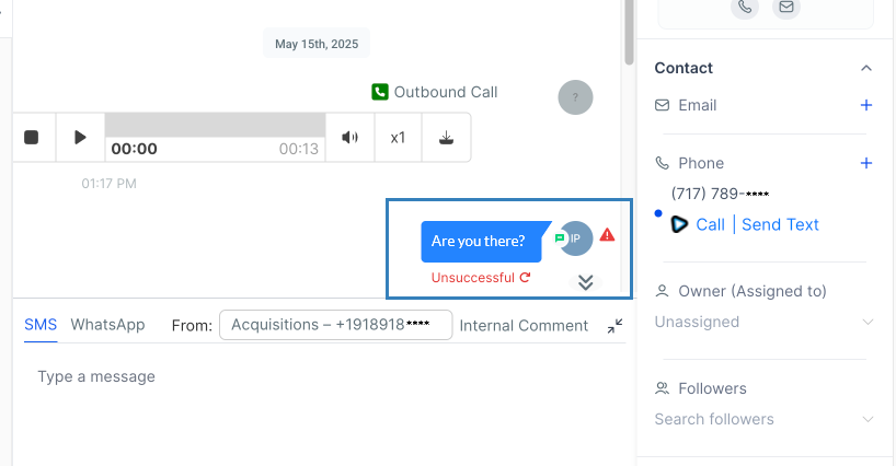 You can see these errors displayed in your Chat box on your Invelo Dashboard. Head to that particular contact and open the conversation in the Chat box.