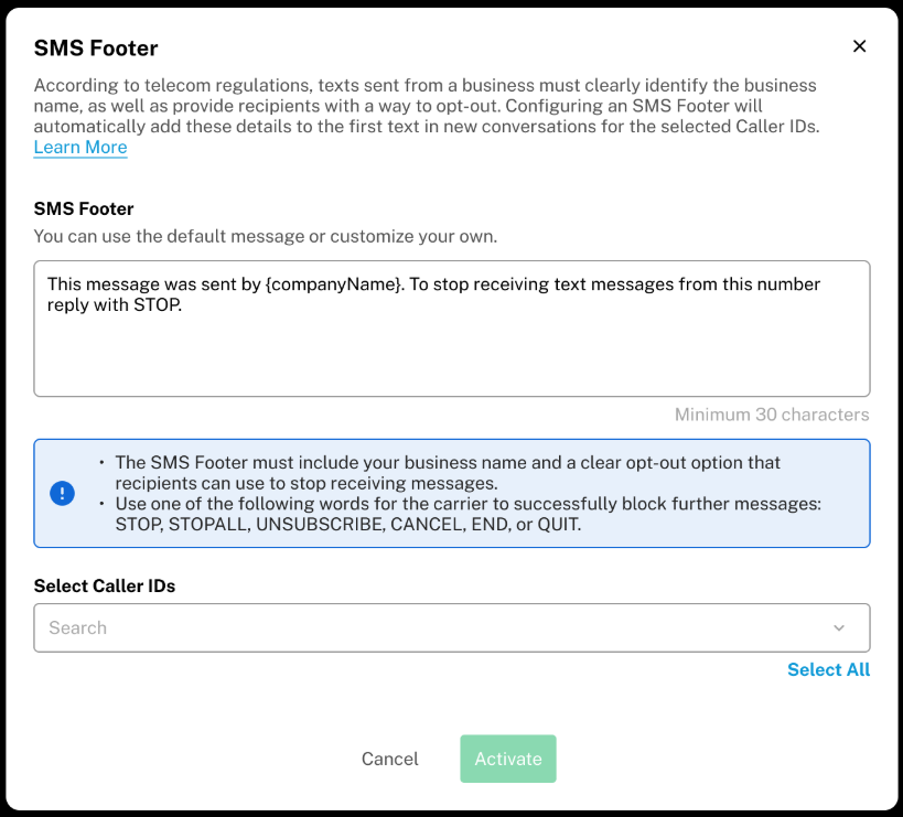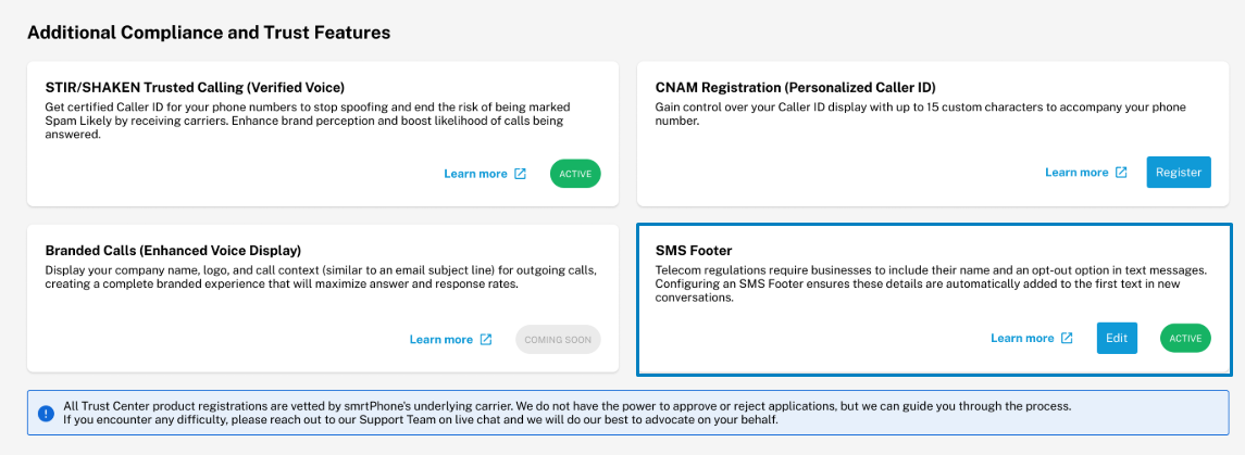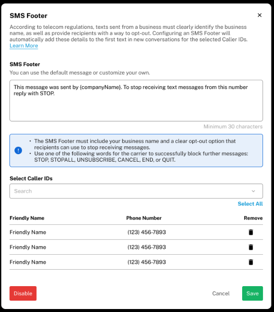 This option is customizable at any point in your Trust Center, as well as the option to disable the SMS Footer. And of course, to enable it back.