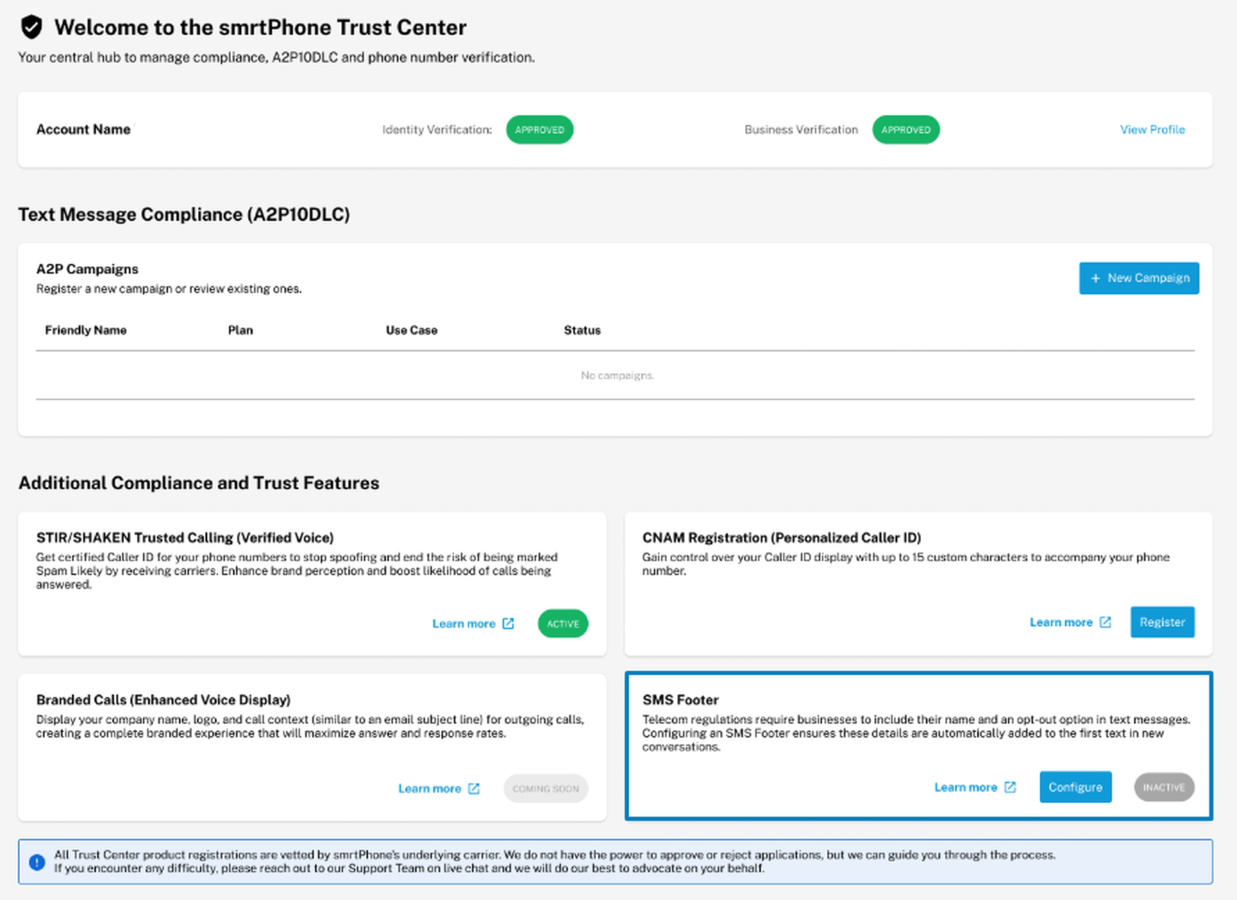 Head to the Trust Center to configure your SMS Footer. On the right bottom side is the SMS Footer access button. Click on Configure and start the setup.