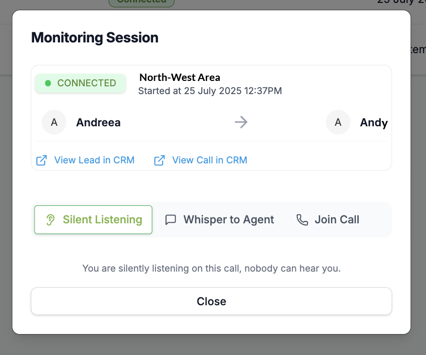 To Listen in on a call, you need to have granted permissions and then access the Monitoring area by going to smrtDialer > Call Monitoring. From here, you can use the feature by clicking the ๐ Listen button next to the session you want to listen to.