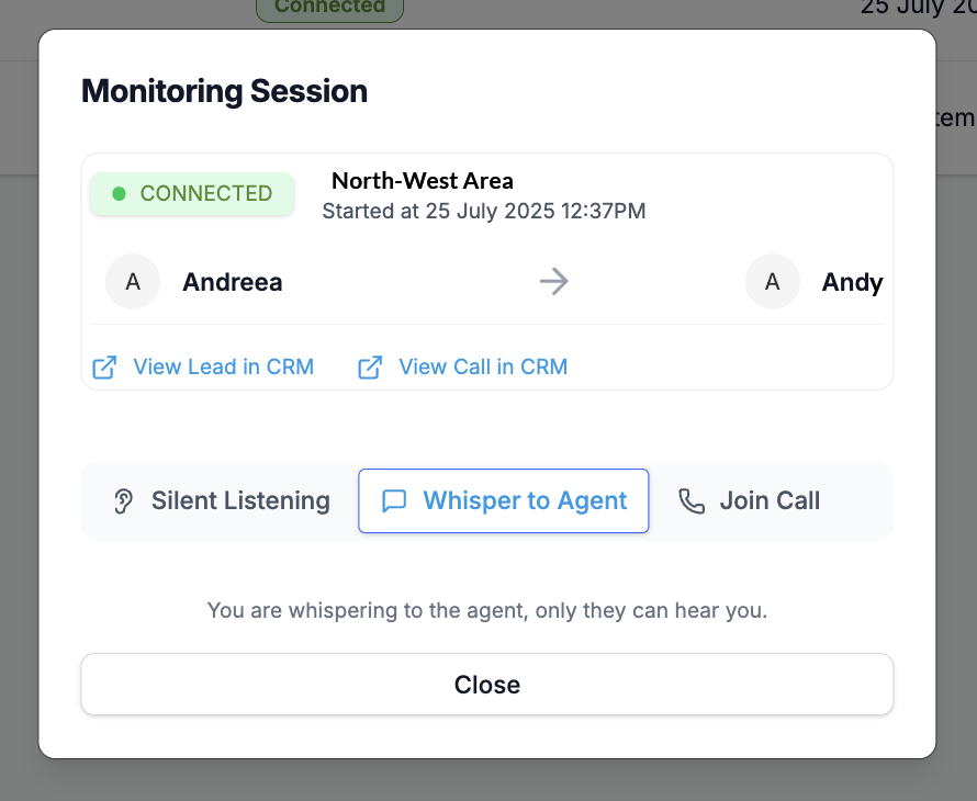 To Whisper on a call, you need to have permissions and then access the Monitoring area by going to smrtDialer > Call Monitoring. From here, you can use the feature by clicking the ๐ฌ Whisper button next to the session that you want to whisper on.