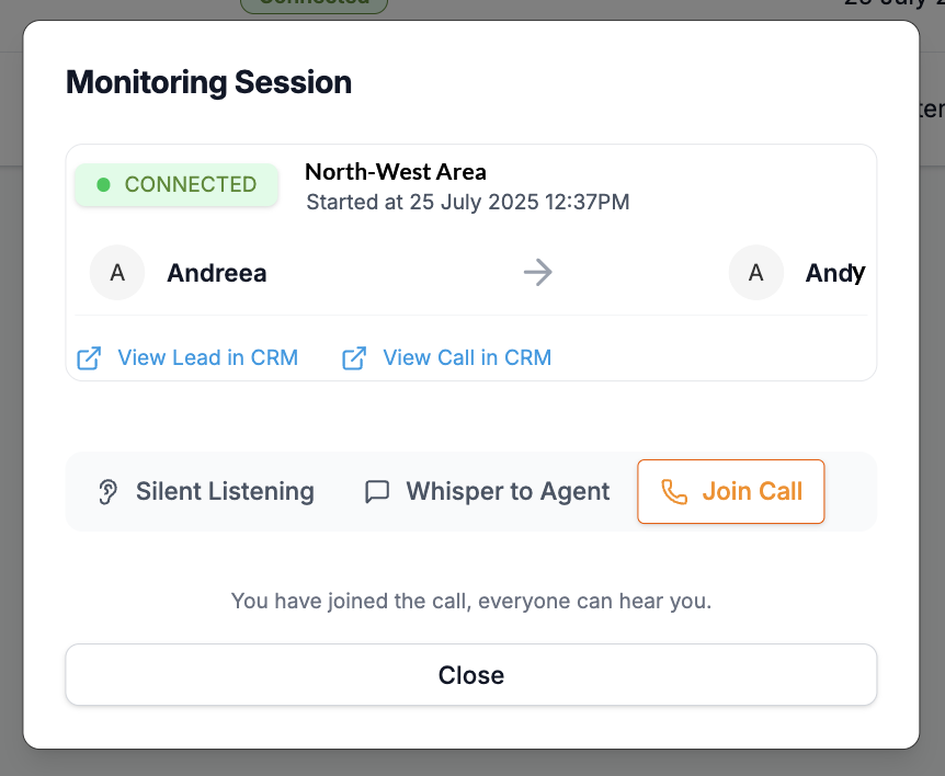To Join to a session, you need to have granted permissions and then access the Monitoring area by going to smrtDialer > Call Monitoring. From here, you can use the feature by clicking the ๐ Join button next to the session that you want to join to.