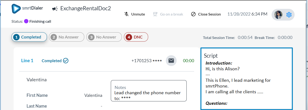 Depending on your campaigns, different Call Scripts will appear during the call, under all your lead's details. It will include all of the fields you previously set.