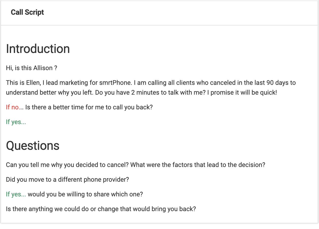 To make the script easier for your agents to read and follow, we suggest you apply some basic design to make it easier for them to follow and glance through while actively talking with a client.