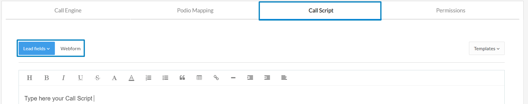 ๐ Podio Users: if you are already using a Podio web form and want to switch, you must click on the Call Script hyperlink at the top of the tab window, next to the blue Lead fields button. Once you have enabled the Call Script Guide, it will disable your Podio Web form -- although the link will still remain and you may re-enable it at any time. You can read more information at the bottom of this article.