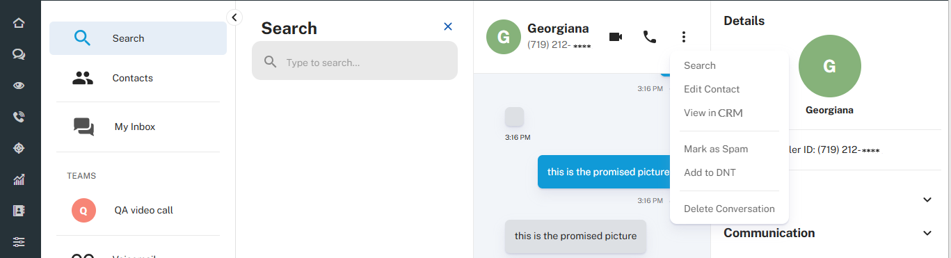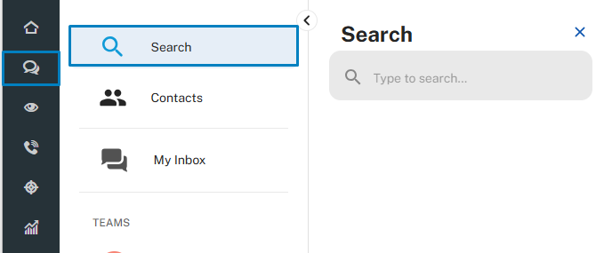 There are two options at the top of the submenu under the header Messages: Inbox and Voicemail - personal and teams. Access the Inbox tab to use the search function for both individuals and teams.