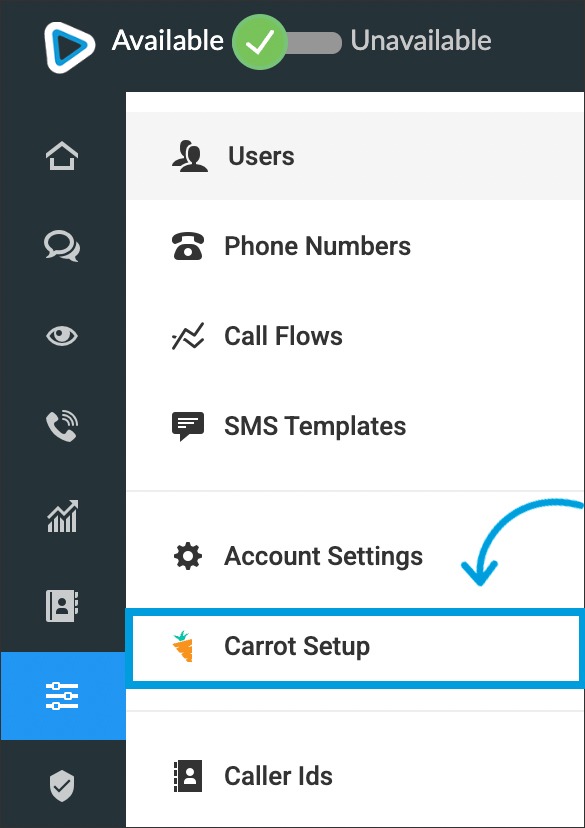 Carrot CRM users (with appropriate user permissions in your smrtPhone account) can customize settings related to the integration between smrtPhone and the CRM.