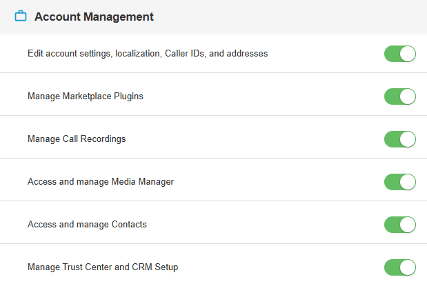 • Manage inbound Call and SMS Flows - Gives control over the Flow Builder section of the Admin Panel.