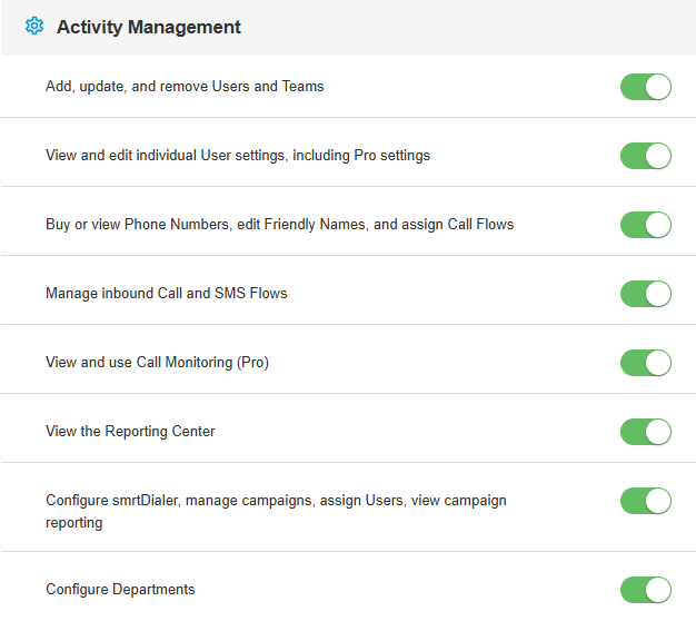 There are over a dozen individual permissions you can assign Users to provide flexibility in managing your smrtPhone system