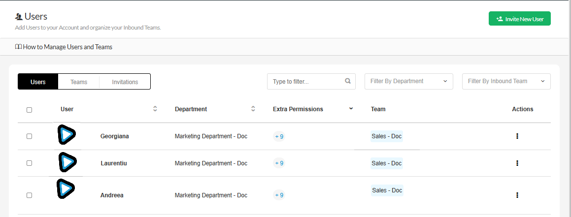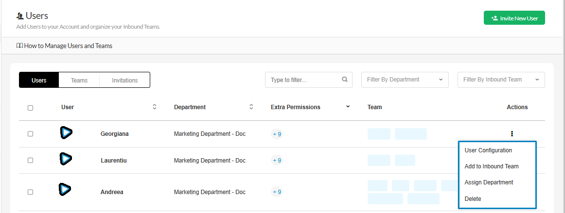 The bulk actions allow you to assign multiple users to an Inbound Team or a Department at once.