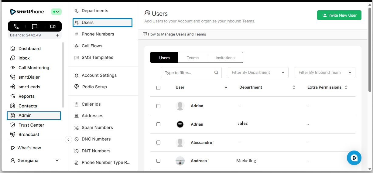 Users can be given greater access to manage their smrtPhone account. You can assign these permissions when you invite a user into your system or modify their permissions from the Admin in the smrtPhone Dashboard from Users. These permissions are customizable at the account or user levels.