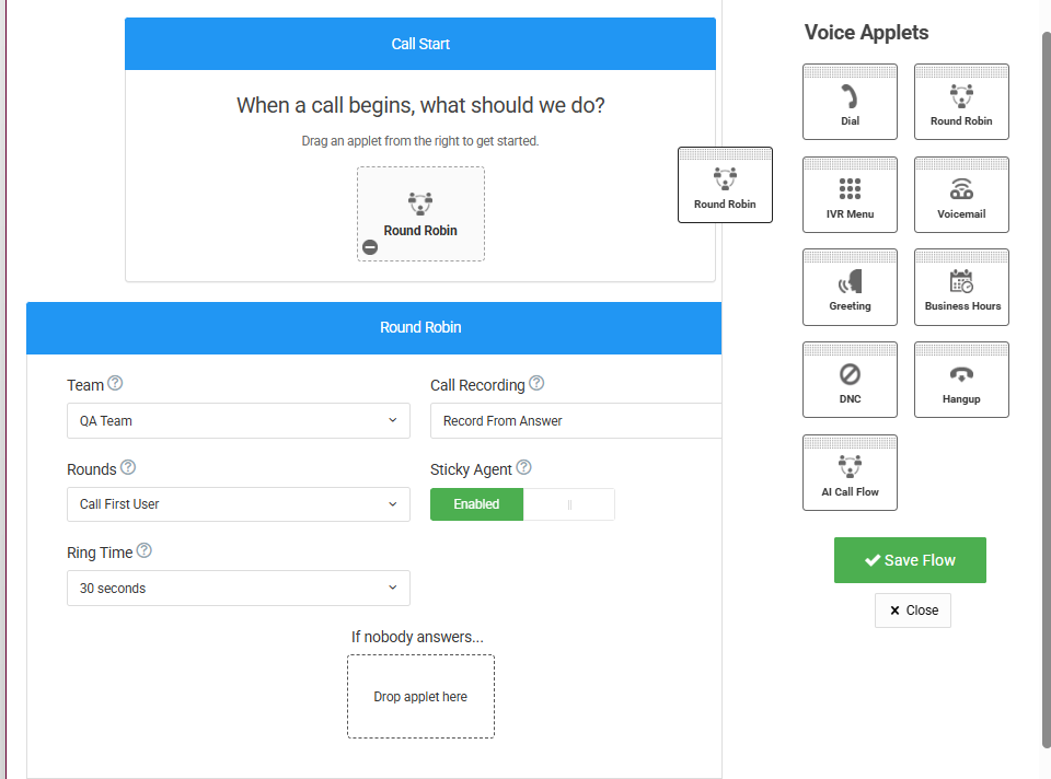 If nobody answers, you have the option to take a voicemail or to advance to another Applet from the flow creator. This can be fully customized to best suit your business' needs.