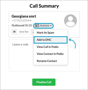 You can also add to DNC directly from the smrtPhone dialer by selecting Add to DNC from the Actions menu when finalizing a call.