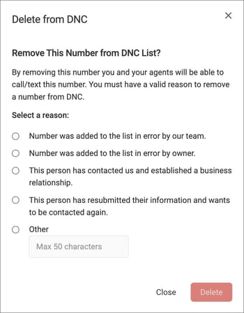 You must confirm the reason why you are removing a number from the DNC List.