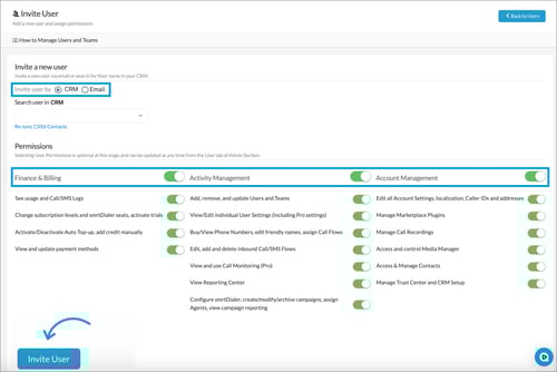 Note: Users in smrtPhone (for the phone system and the power dialer) do not have to be members of your CRM system. For example, it is common for companies who use VAs to invite the agents only into smrtPhone to make the outbound calls and not have full visibility into the CRM.