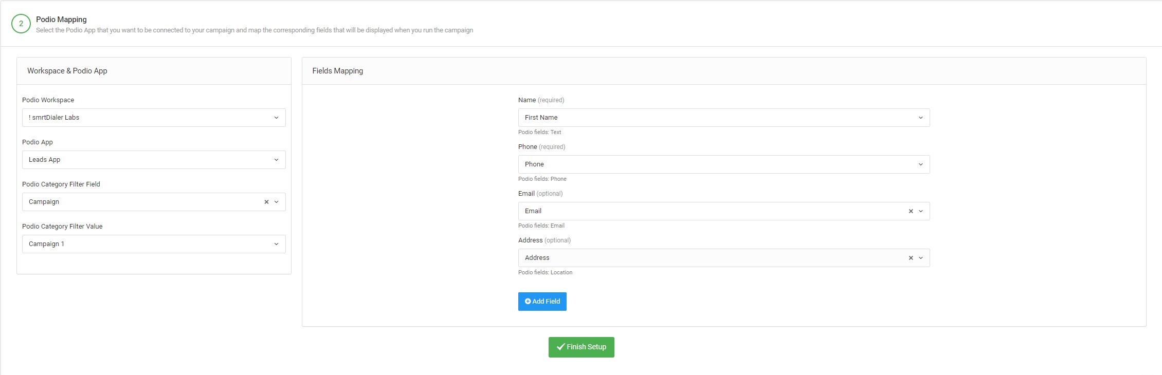smrtDialer Campaign setup: Populating leads into campaigns from a Podio contacts app