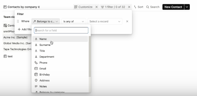 Here you can choose between private and team view, layout of the view, and name your view. Then you can customize the filters. Pick your choice from the drop-down menu.