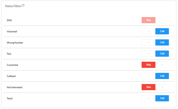 Inside the Campaign Settings Screen - Call Engine, you have the option to both choose what statuses to skip during your call sessions and what statuses to filter as wrong numbers.