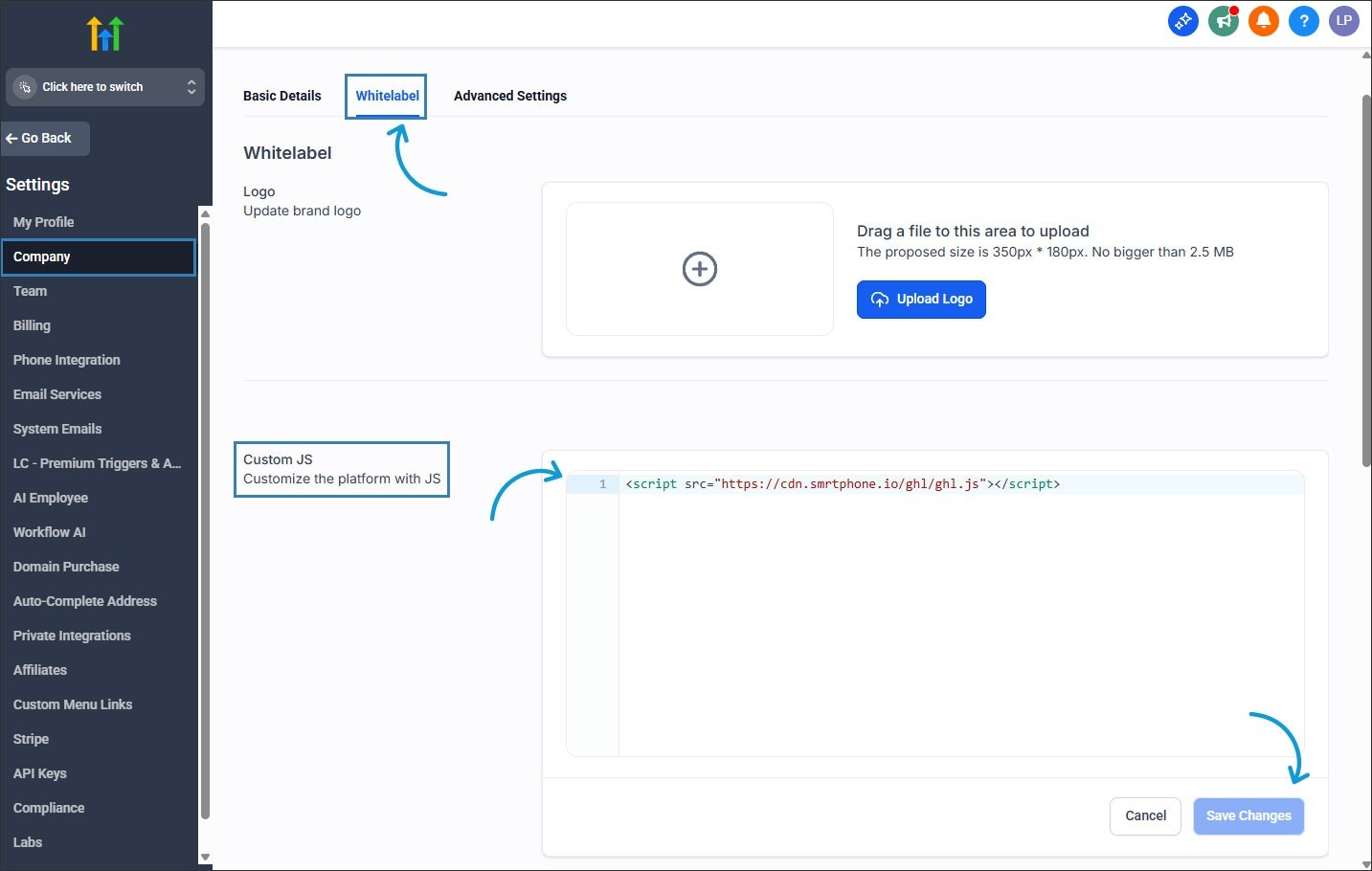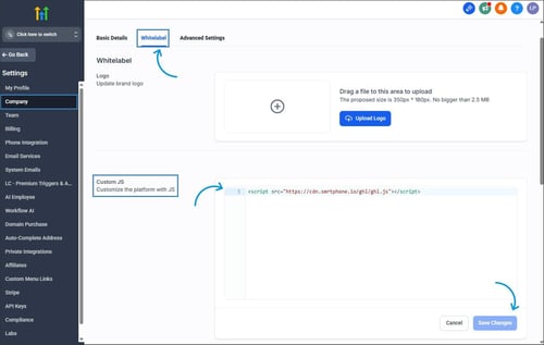 When you’re in the agency view, click on Settings (bottom left corner) > Company > White Label. Then paste this in there, click Save, and it will apply to all sub-accounts.