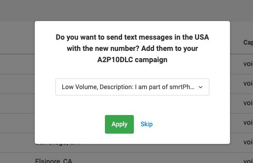 If you currently have more than one A2P-approved campaigns, and you don't pick one from the drop-down menu but click on Skip, the system will choose a random campaign from your list and assign the new phone number(s) to it.