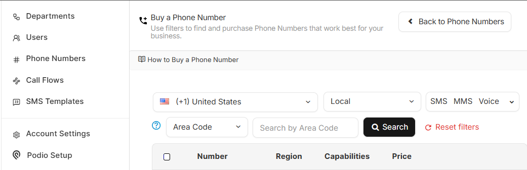 Choose between Local, Mobile, or Toll-Free Numbers, and ensure that the number you choose has all the capabilities you need: Voice, SMS and/or MMS. Use filters to narrow the search to find the best fit.