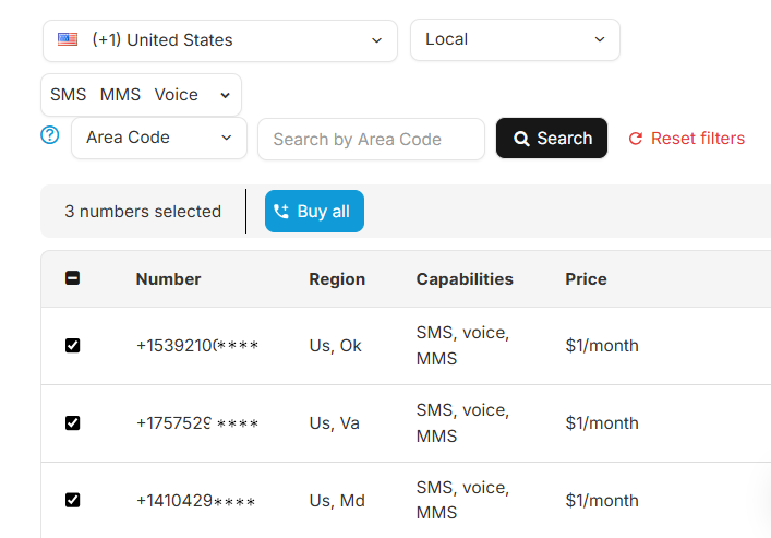 You can choose to buy multiple phone numbers at once - up to 10 at a time. Select the ones that you want and then click on the green button Buy all.
