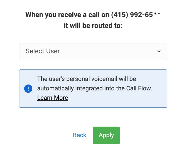 Select the User and click Continue. This option creates a simple Dial Applet + Voicemail flow for the individual User (ending in their personal voicemail box). For the SMS flow, it will create the SMS Inbox option from the available apples.