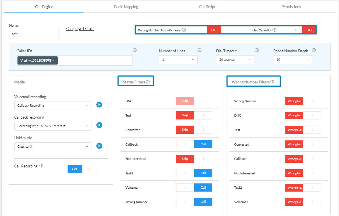 In other words, if a lead is marked after a call with a call status like "Not interested" and the corresponding Not Interested was switched to "Wrong number" in this section... within the next calling session, that particular lead will be skipped or removed (if Auto-Removal is on).