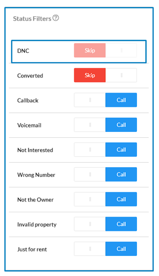 You can see the call statuses in the Call Engine Tab. Choose from the options Skip/Call and they will work according to your selection. These filters are not only for leads or property. They can update both the property status and/or the phone number status.