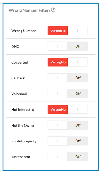 The Wrong Number Filter section of the Call Engine tab controls which of your status filters are considered wrong numbers. This section is helpful for companies who want to differentiate between different kinds of wrong numbers to understand ROI from a lead list.