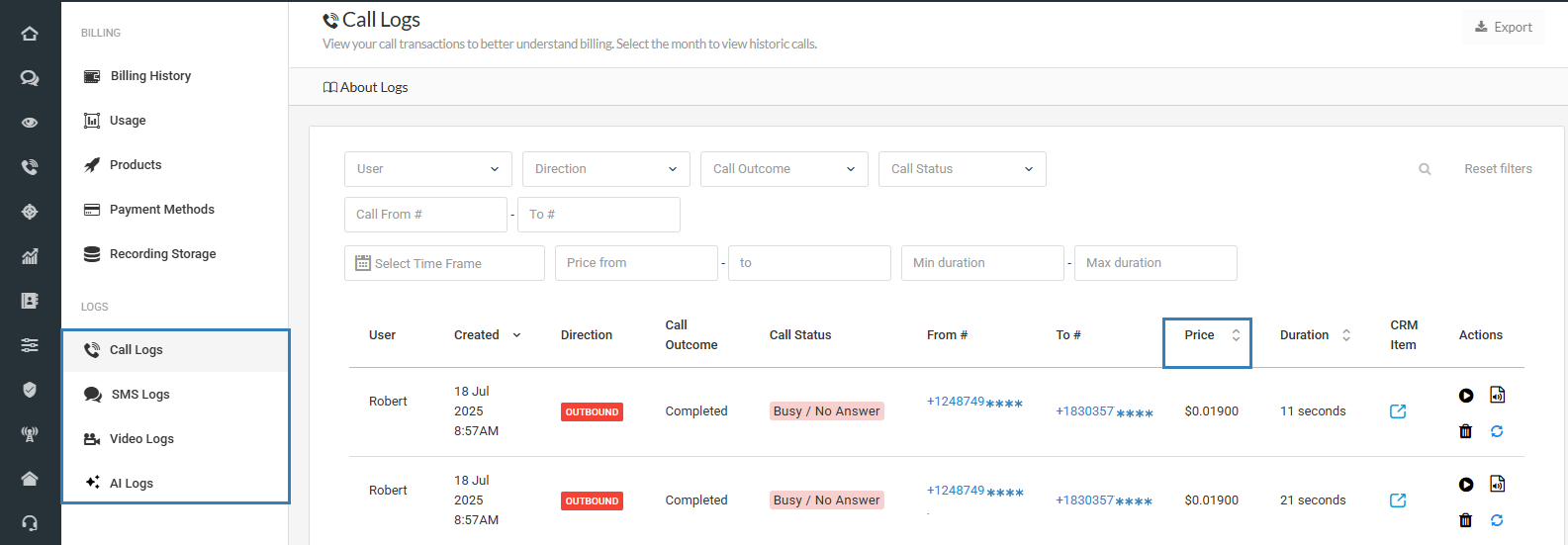 You can also check the Call Logs, SMS Logs, Video Logs, and AI Logs menus in your smrtPhone account to see the actual prices for every call/SMS that you make or receive.