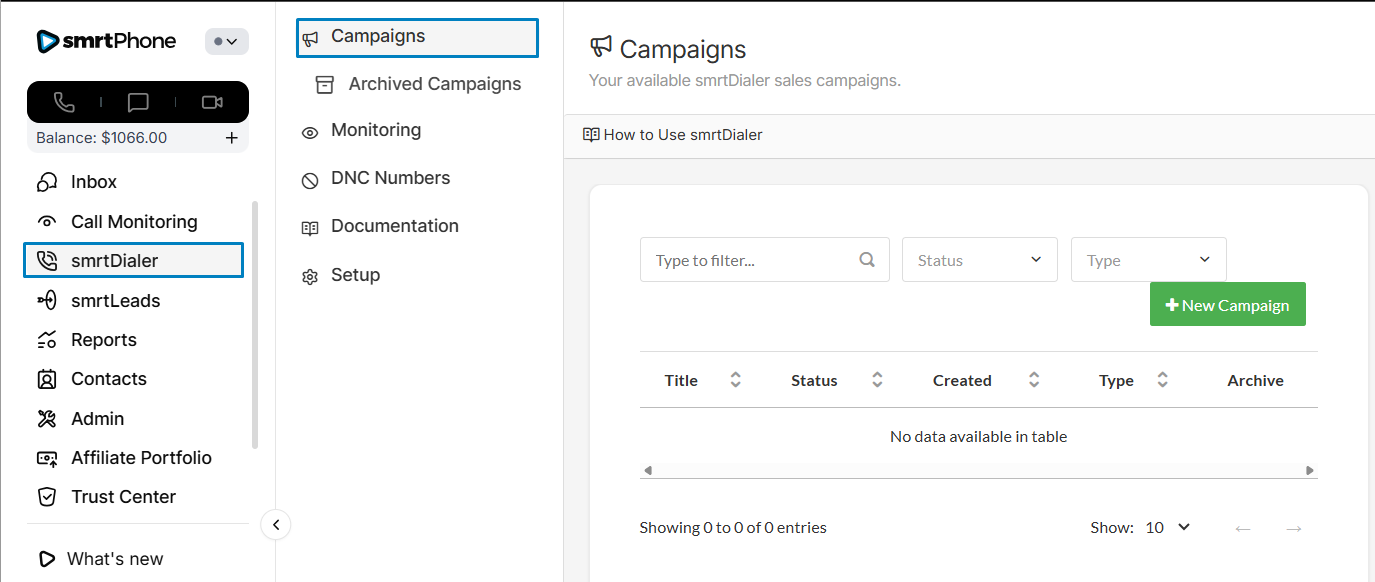 Campaigns is the menu that matters most, and it is also the default menu when you click into smrtDialer.