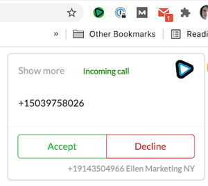 When an inbound call rings to you, the smrtPhone Chrome Extension icon will flash green, you'll hear ringing, and a small Caller ID banner will drop down, no matter what web page you are viewing.