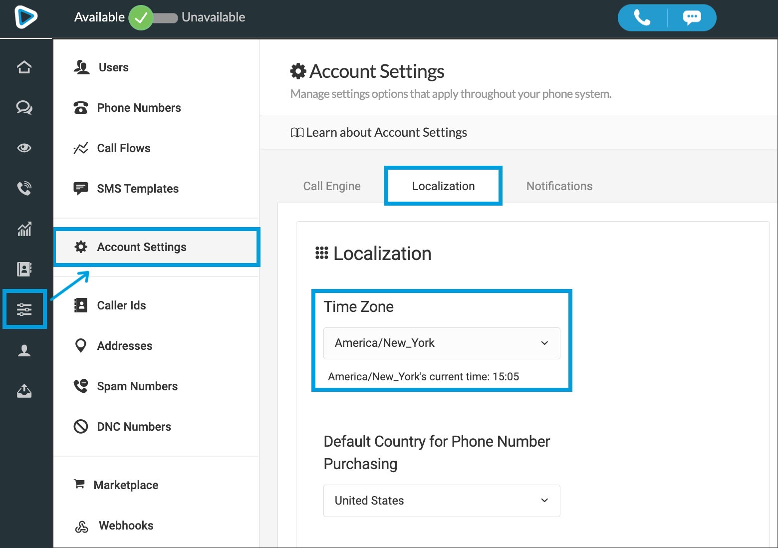 To set up the Time Zone for your smrtPhone account, head to Admin > Settings > Localization.