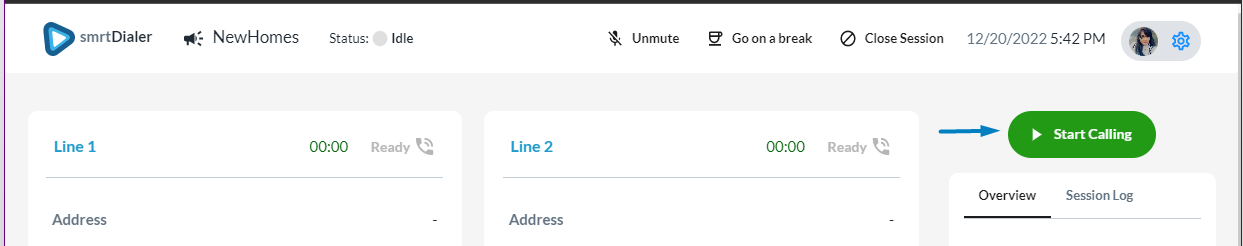 Once you are inside the campaign you'd like to dial, you can start a new dialing session by clicking the blue ▶️New Call Session button in the middle right.