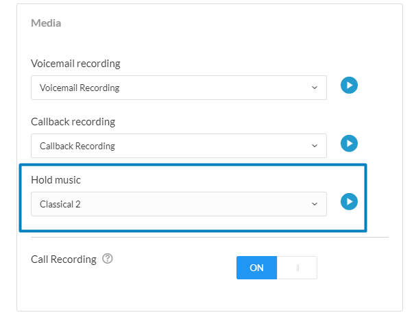 Go to smrtDialer - > Campaigns - > Settings - > Media - > Hold Music. On the newly opened page, you will have the option to either select one of our default sounds or select one from your Media Manager.