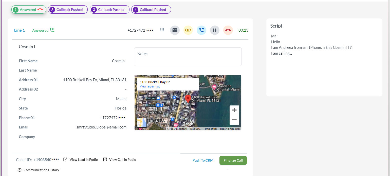 Once the call connects, the information for the lead will populate the screen. You can address the call, follow the script (if included), take notes, and complete the call when you are ready.