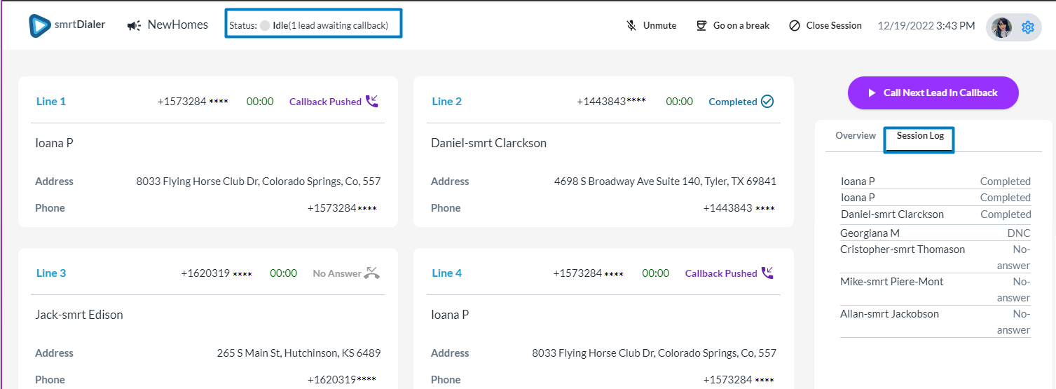 On the top of the current Lead Window, you can also see what happened with the other lines calling (if the case - they got a Callback message, they reached Voicemail, the call was missed, and so on), the status of the campaign, or mute or unmute your microphone, go on a break option, Close session button, and, as we mentioned before, the Settings.