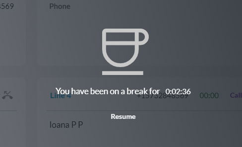 When an agent selects to Go on a break, the system tracks this break time, giving more detailed call session information and a better understanding of campaign/list performance. You can come back to your campaign by hitting the Resume button.
