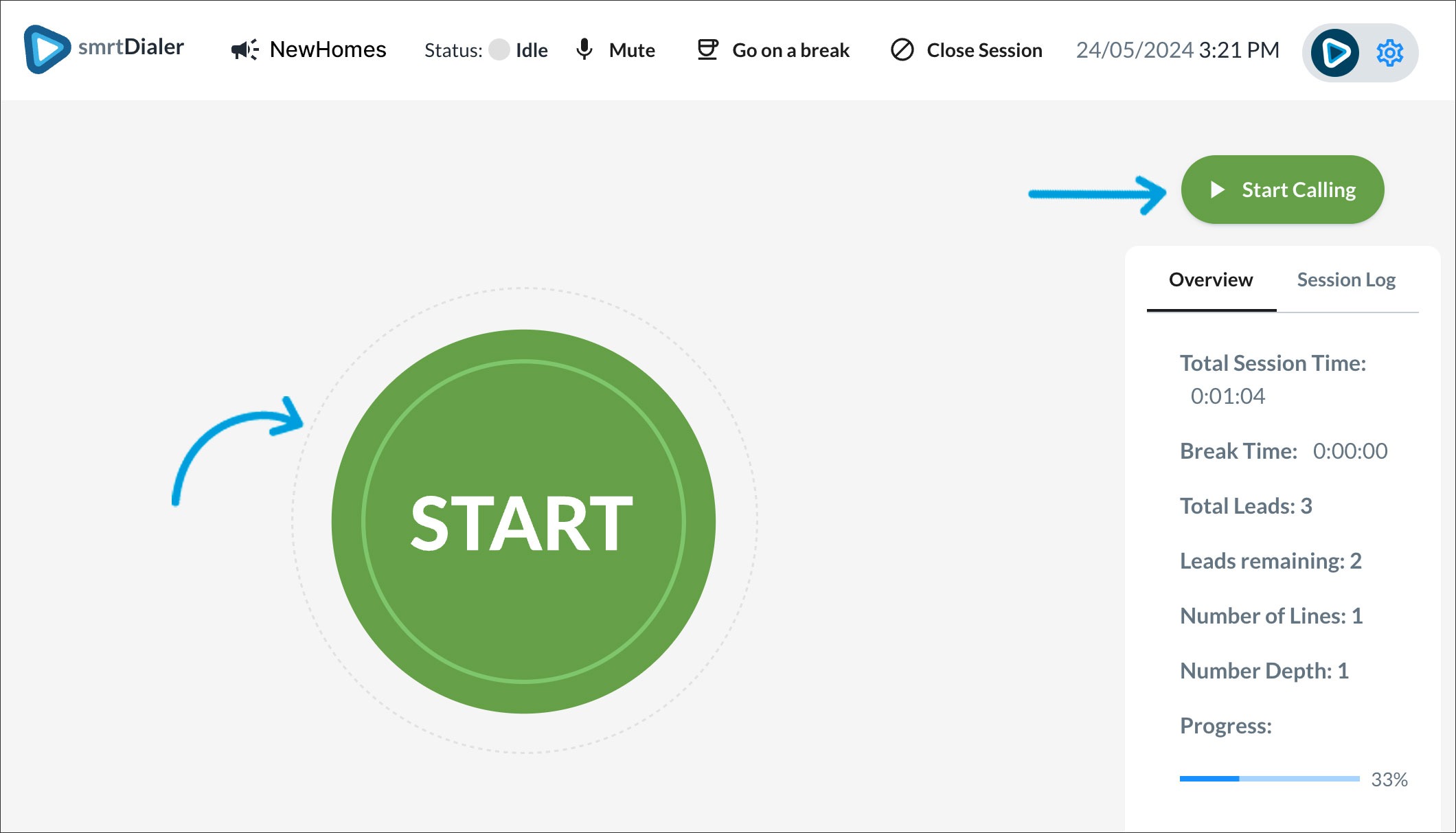 Once you click New Call Session to run the campaign, you will be placed online, but dialing will be paused. Press any of the Start buttons to start dialing.