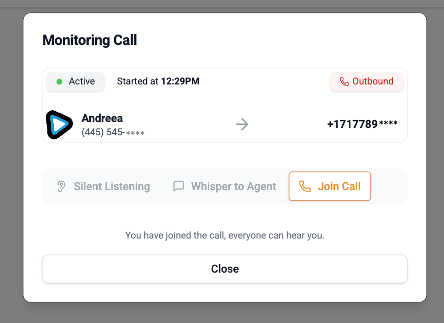 The Join feature allows a Pro Subscriber with applicable permissions to join an active call on their Account. When joining, a conference call will be created between two users and the person on the line. For example: a Supervisor, an Agent, and a Lead.