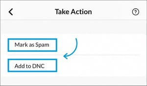 d. Action - Before finalizing the call, you can also choose to send a text, redial the contact, start a video call, or take further action. Press the gear icon Action, and you will be able to mark the number as SPAM or DNC directly from your Mobile App.