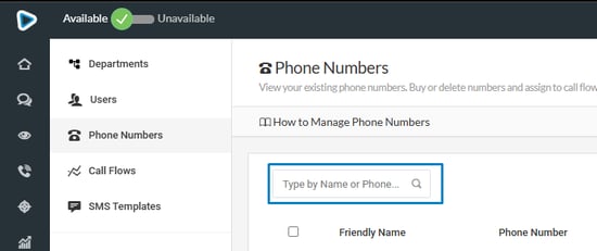 By using the Search bar above the table of numbers, you can narrow down the list of Phone Numbers in your portfolio.