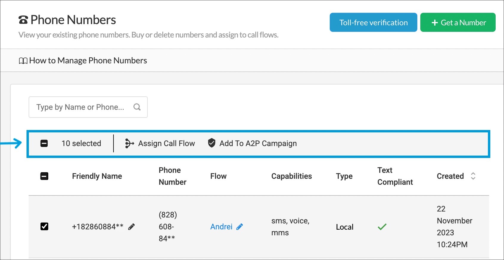 • Add to A2P Campaign - Assign all the selected numbers to a particular A2P 10DLC Campaign